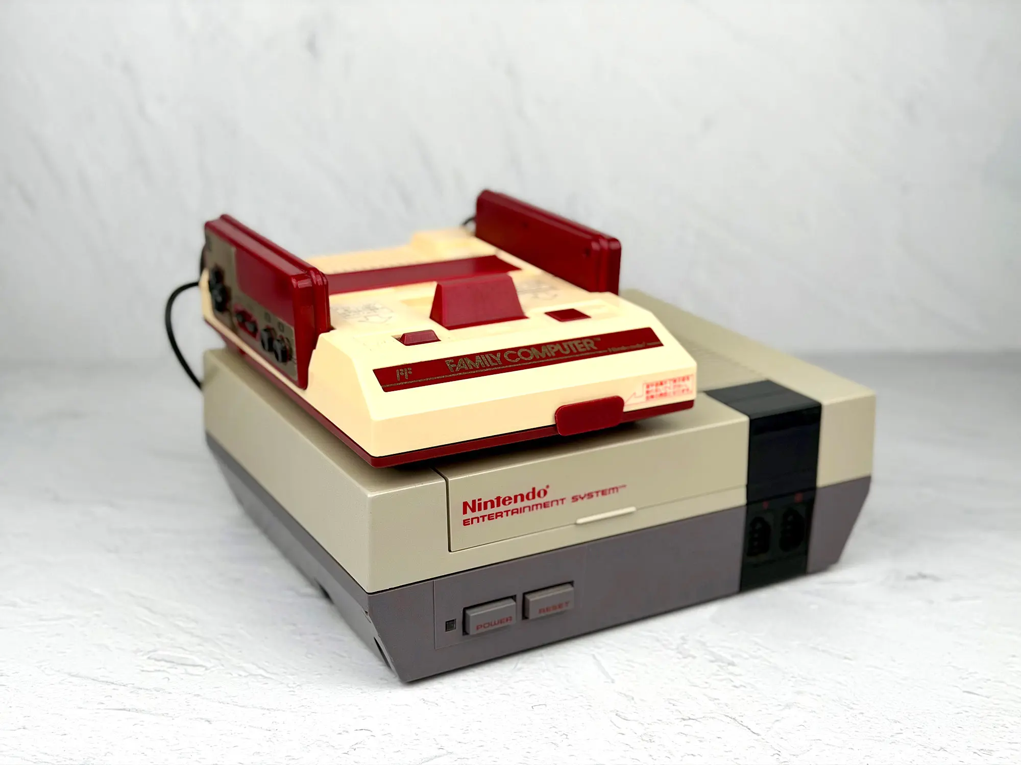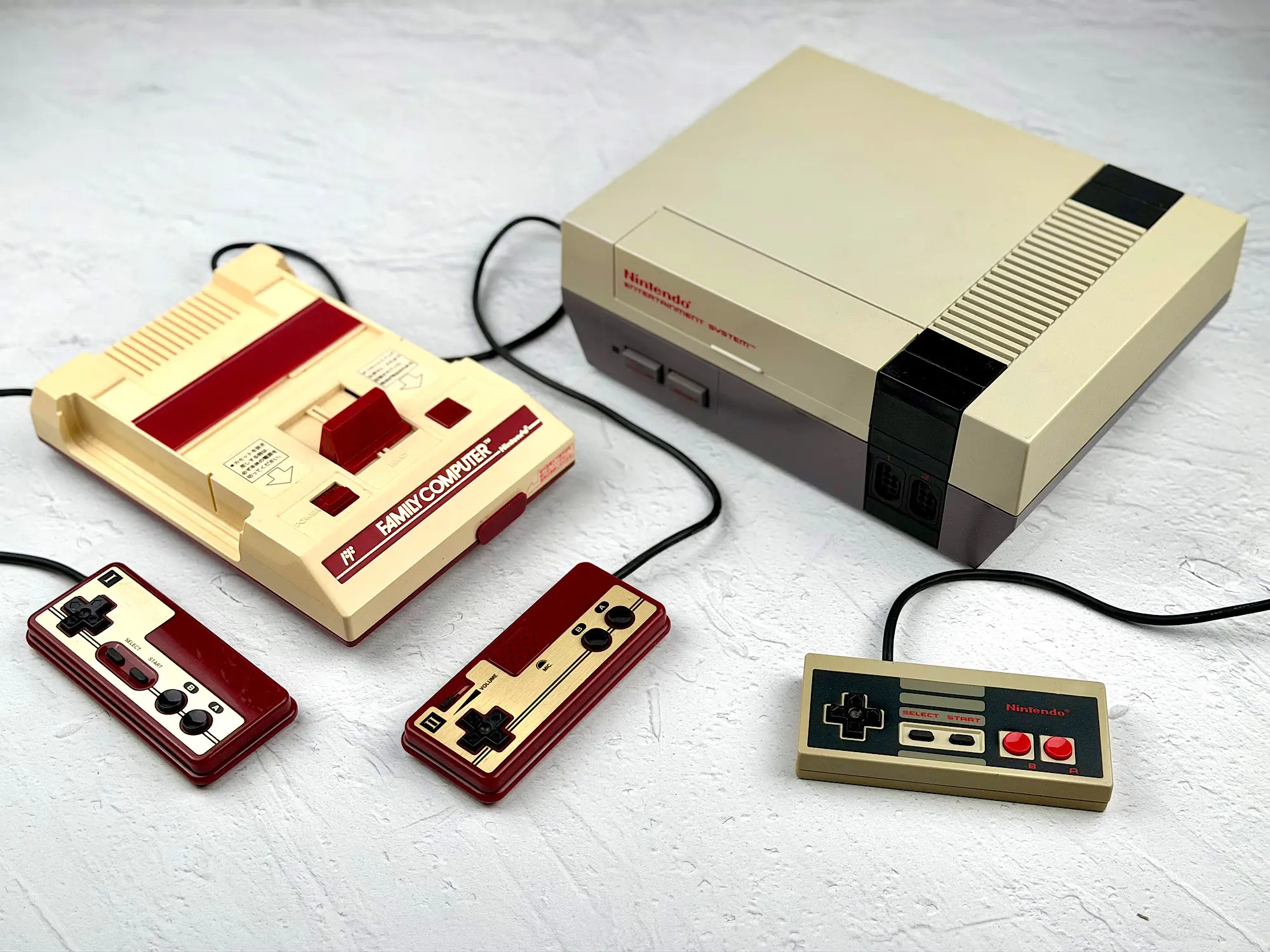 This was the first (and basically the only) Nintendo home console line where the design differed radically by region. The Japanese Famicom looked like a toy: bright red-and-white, soft curves, built-in controllers, and a compact form. The American NES, on the other hand, got a strict rectangular “VCR-style” case, detachable controllers, and a gray-and-black palette.