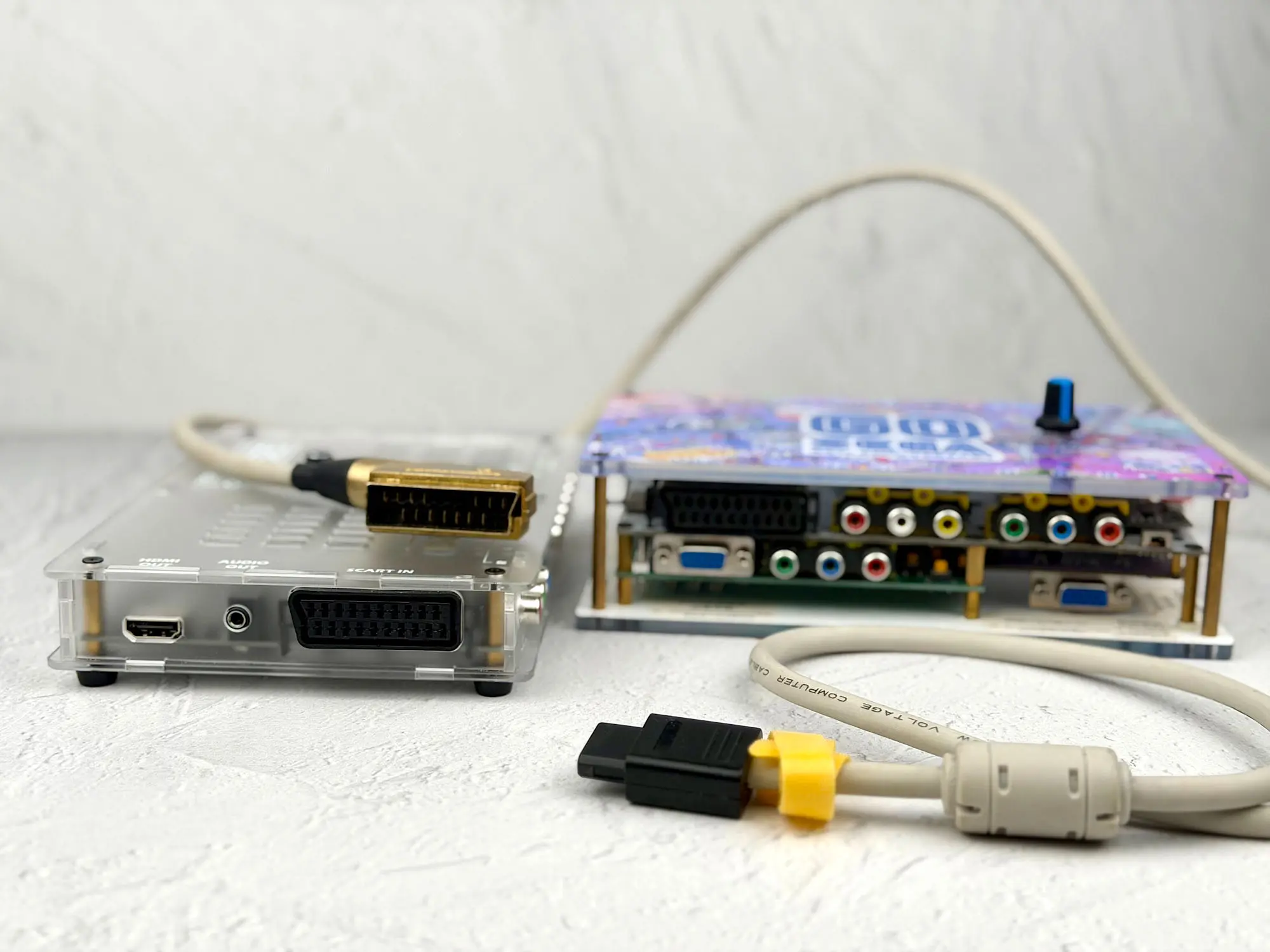 Идеальный вариант — SCART RGB, но телевизоры со SCART почти исчезли. Дешёвые переходники SCART→HDMI часто дают мутную, растянутую картинку с гигантским input lag и искажёнными цветами.