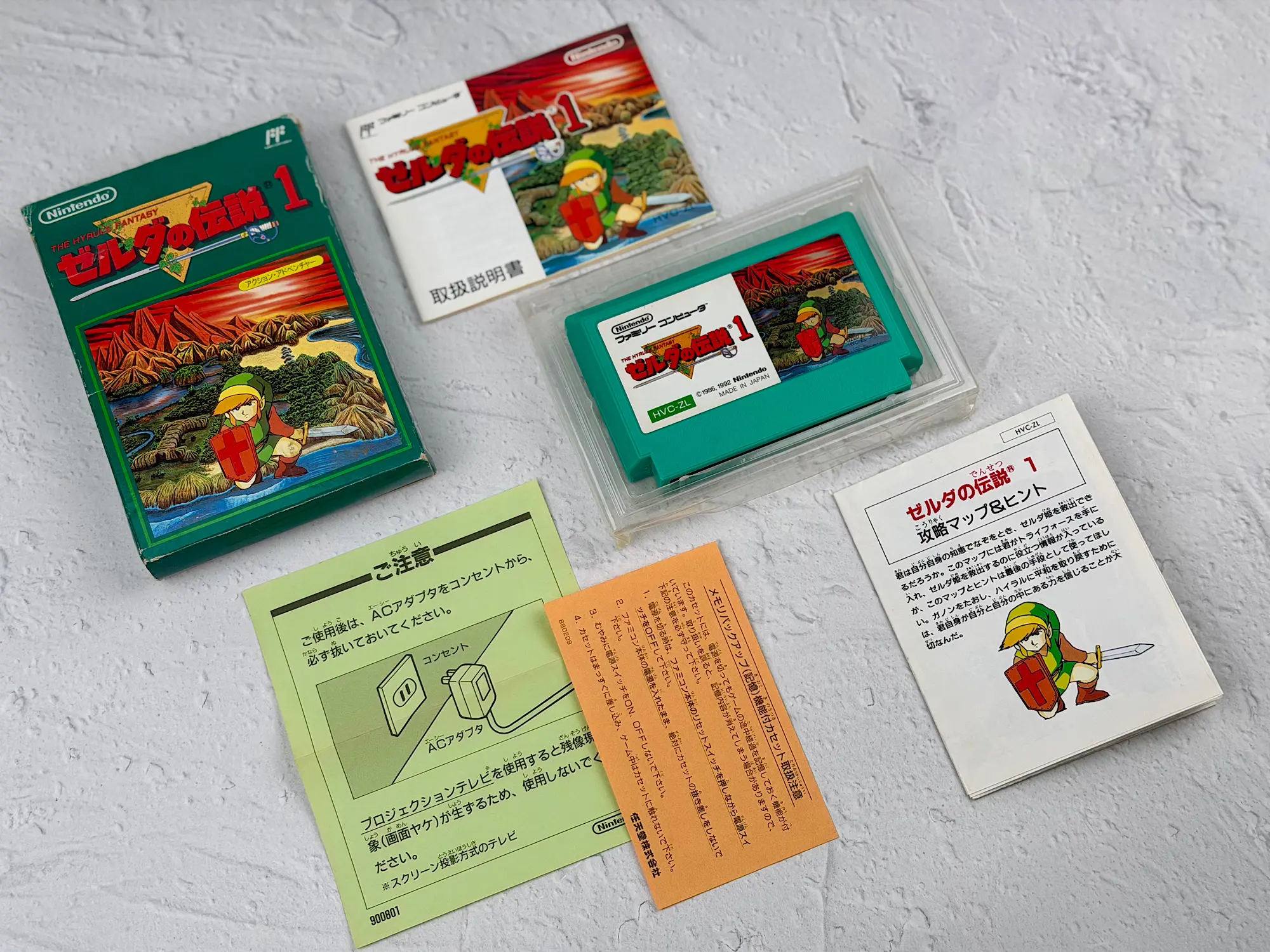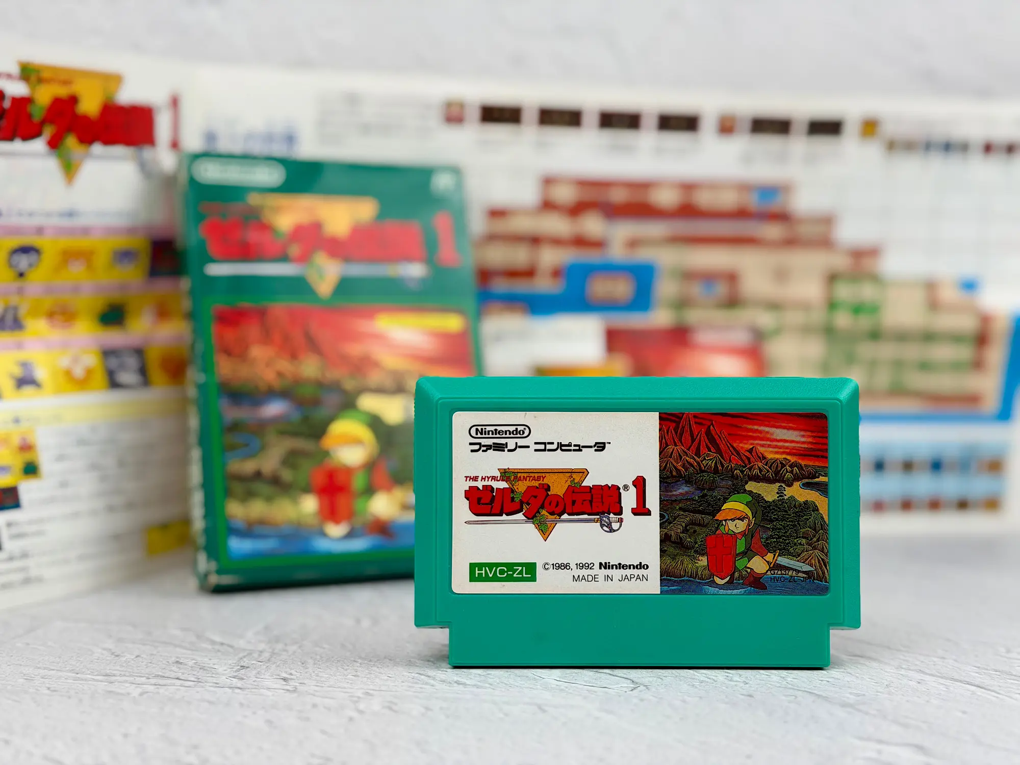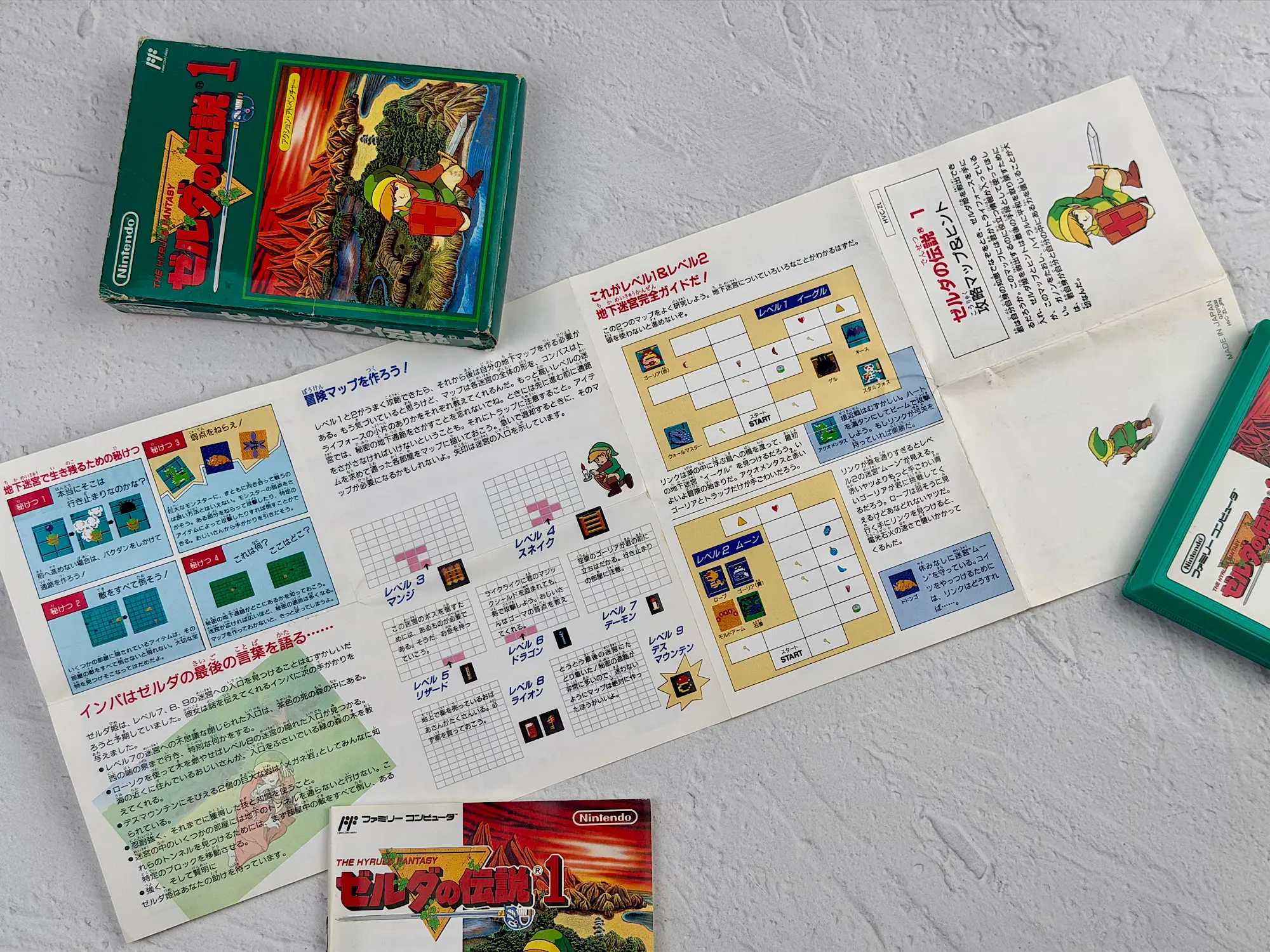 In Japan, Zelda was originally released on disks for the Famicom Disk System, but later it also came out as a classic Famicom cartridge edition. That’s the version shown here: the bright green box, the recognizable cartridge, and a complete set of original documents.