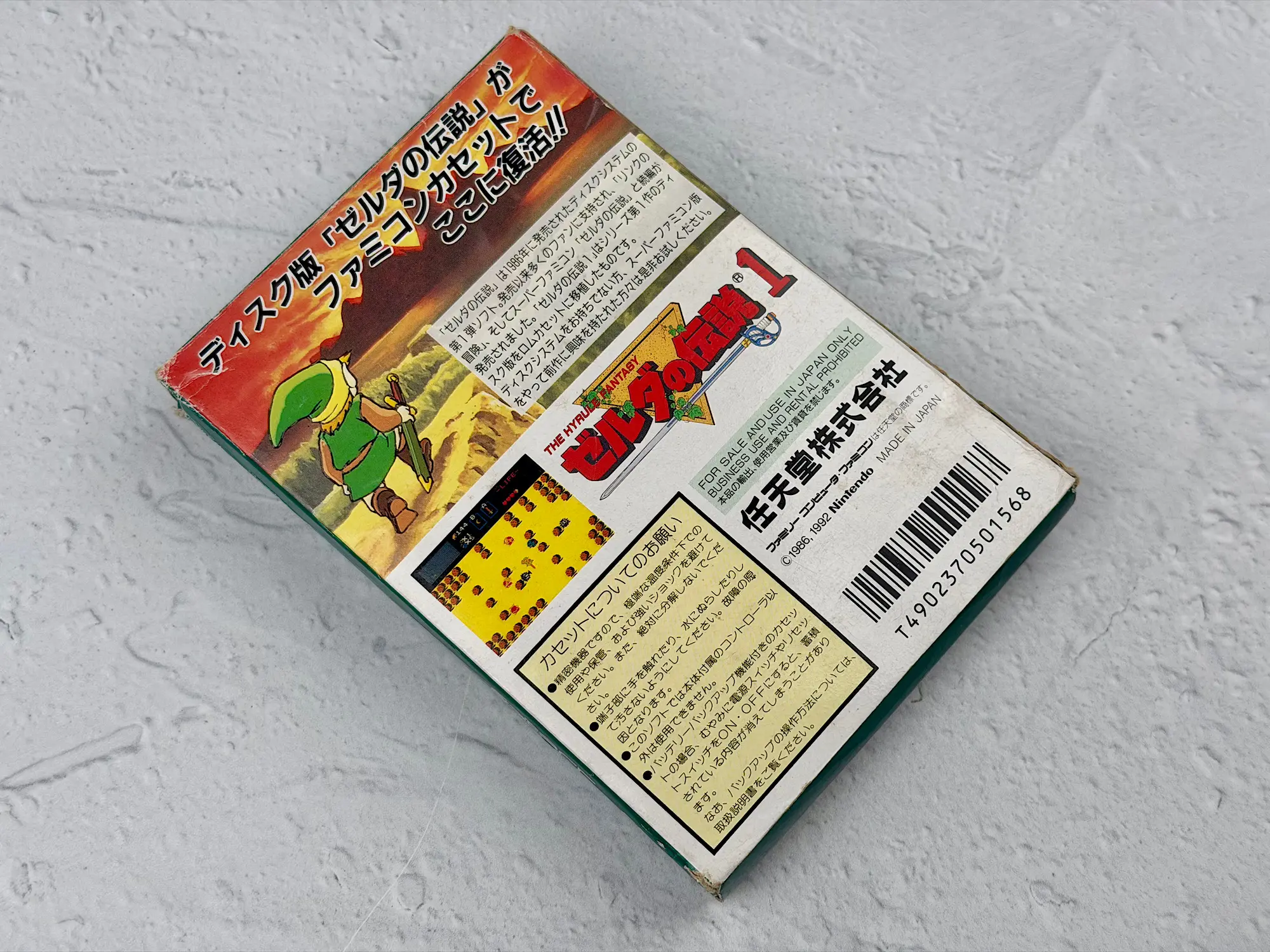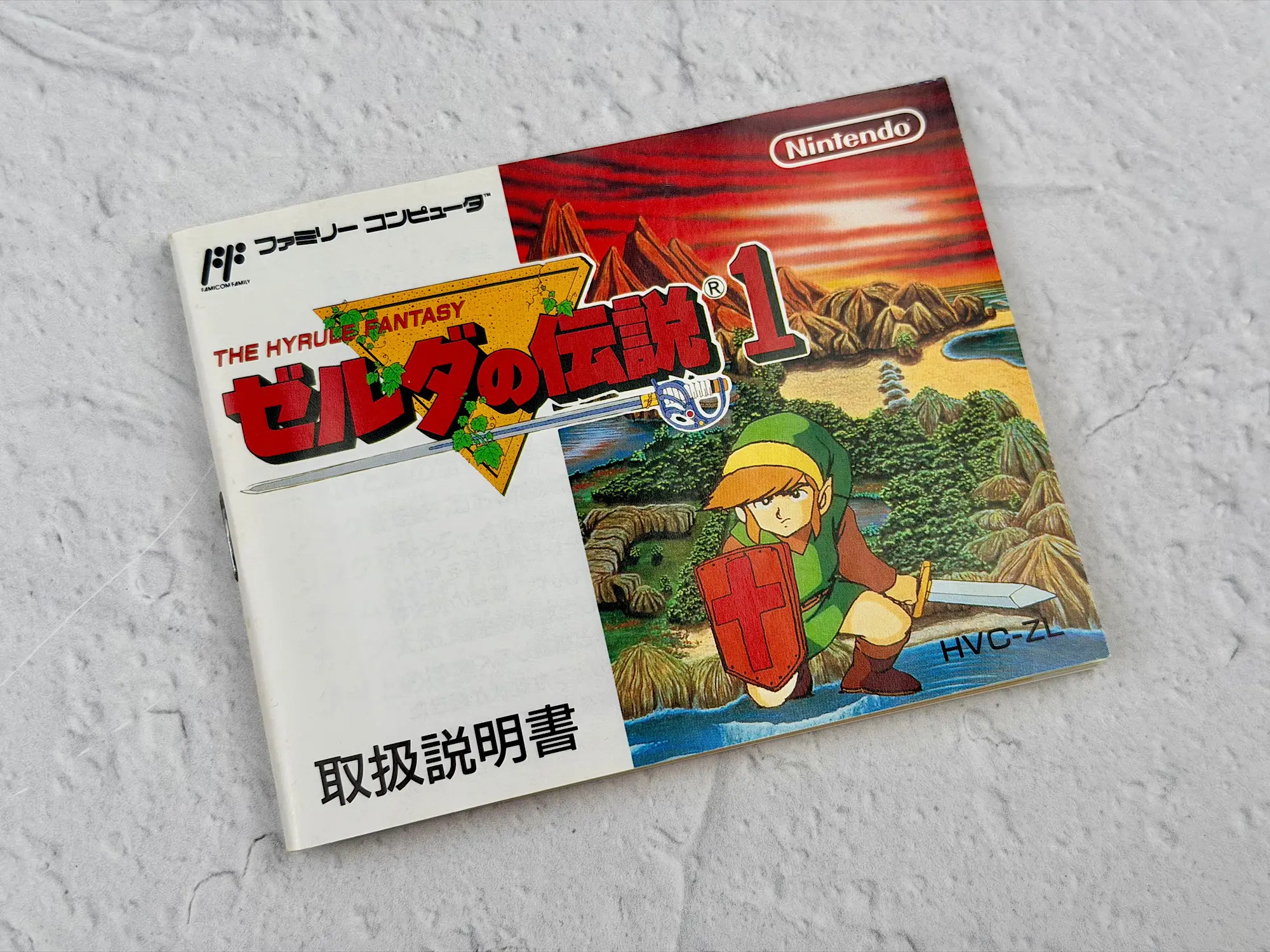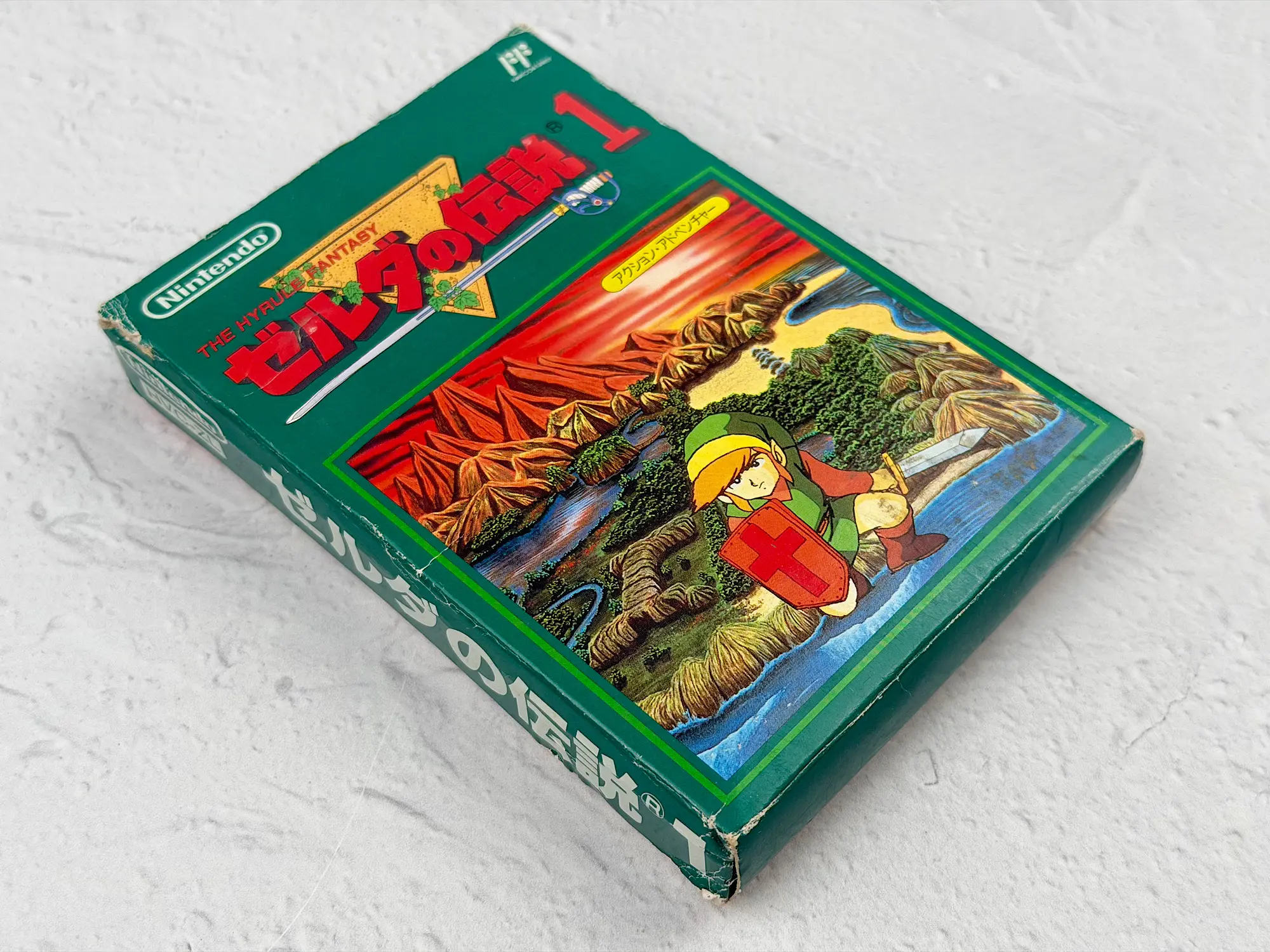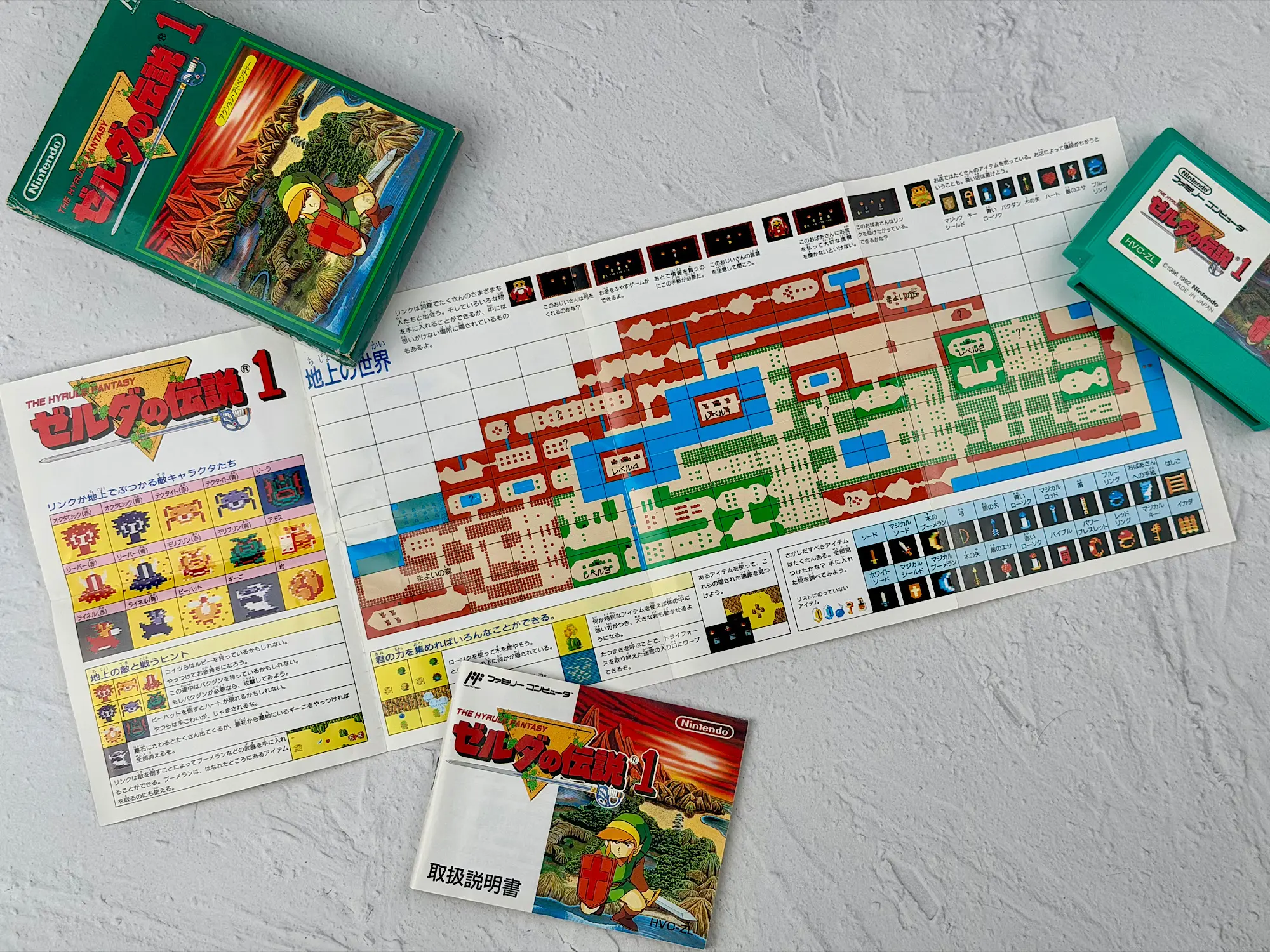 In Japan, Zelda was originally released on disks for the Famicom Disk System, but later it also came out as a classic Famicom cartridge edition. That’s the version shown here: the bright green box, the recognizable cartridge, and a complete set of original documents.